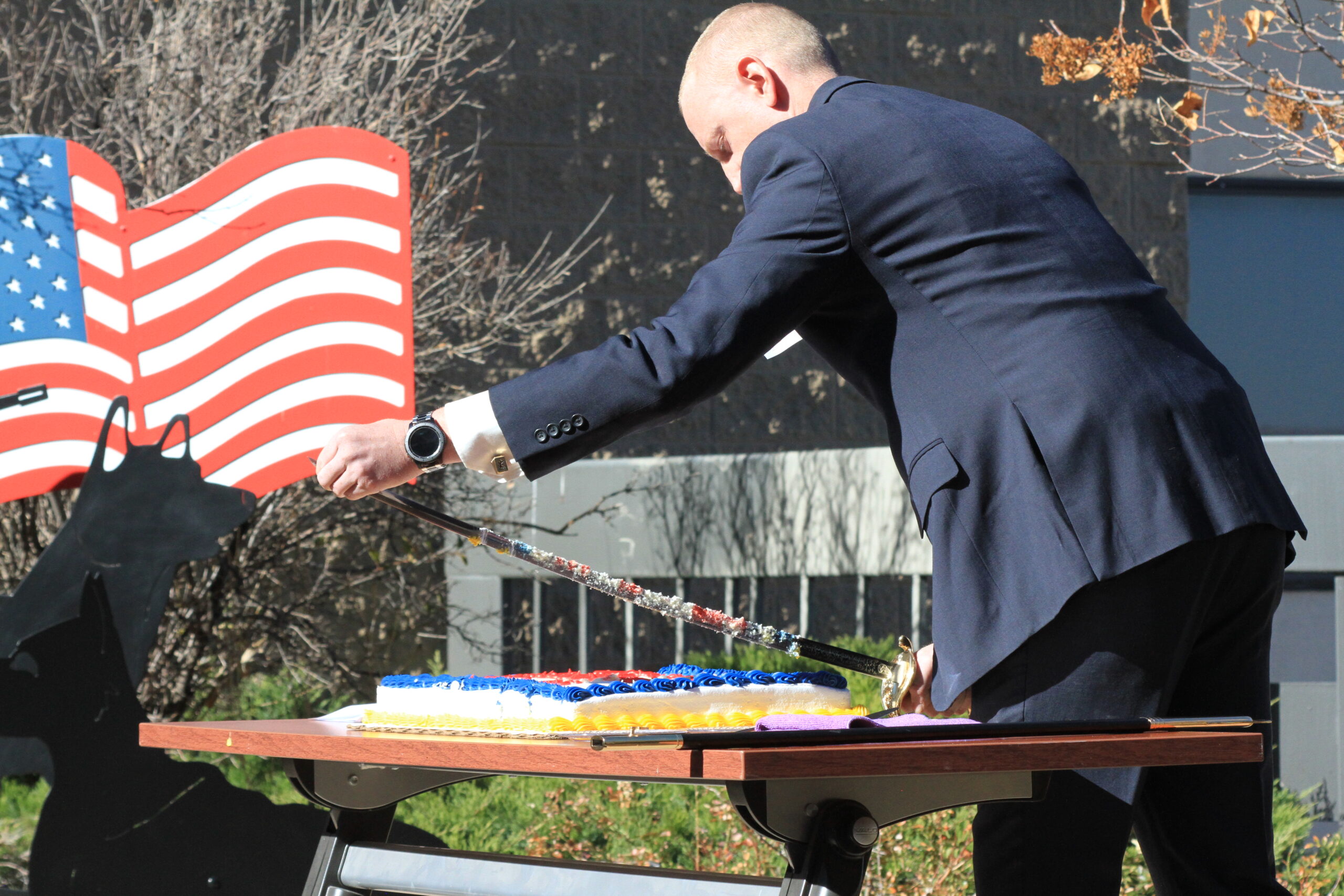 - Sergeant Jacob Post performing the ceremonial cake cutting for the U.S. Marines Birthday.