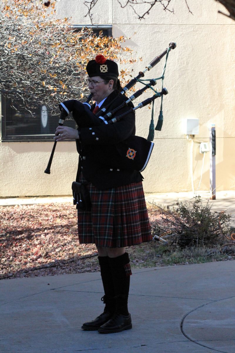 - Andra Stoller playing the bagpipes for the ceremony.